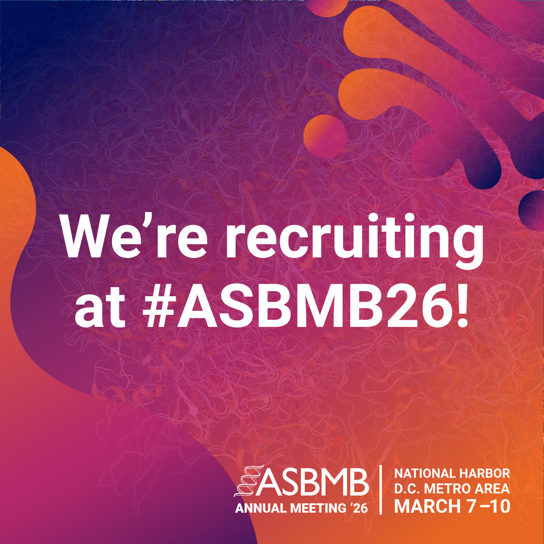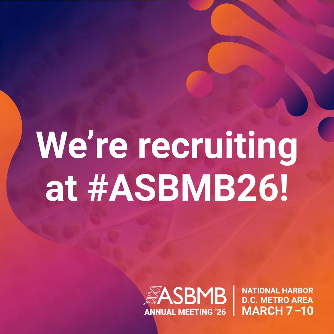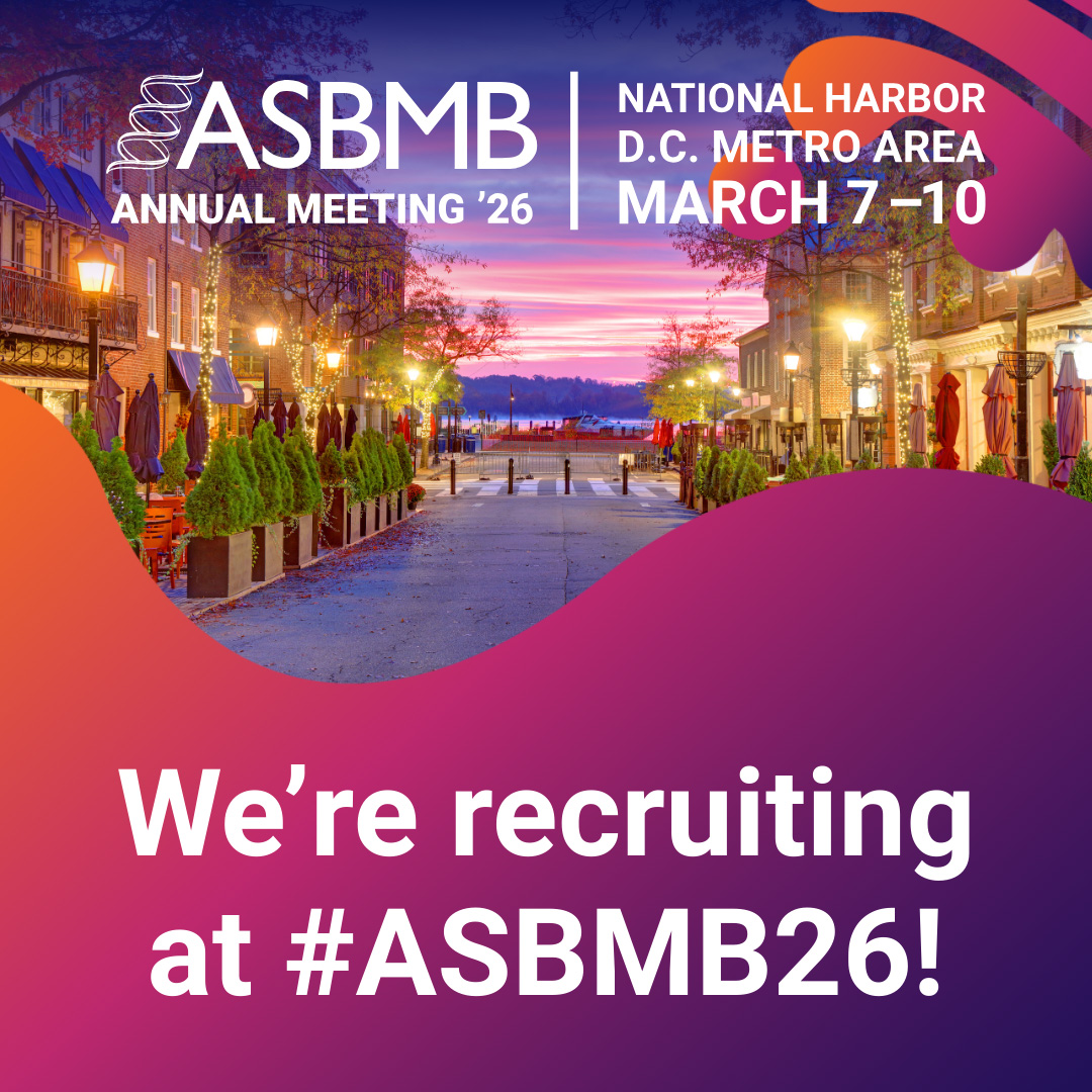 Greetings #ASBMB26 attendees! I work at ______ and we are [hiring/accepting applications/enrolling students]! Drop by our table to talk to us about your goals and learn how our ______ [academic programs, training program, etc.] can help you make the next step in your [career/education journey] possible!