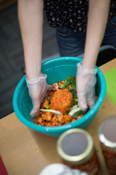 Participants then prepared the foods under the chef's guidance, chopping up cabbage for kimchi, dicing green tomatoes and onions for chow chow and mixing sugar and tea for kombucha. Participants packed and poured their ingredients into two glass jars: one for their own use and one experimental jar that was analyzed in follow-up “science of fermentation” sessions.