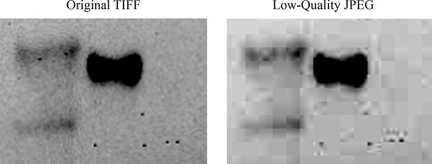 The JPEG algorithm prioritizes changes in brightness and strong edges — features usually absent from the background of typical gels, Western blots or fluorescence micrographs. As a result, large blocks of uniform pixel intensity can appear, creating the impression that the background may have been modified or spliced.
