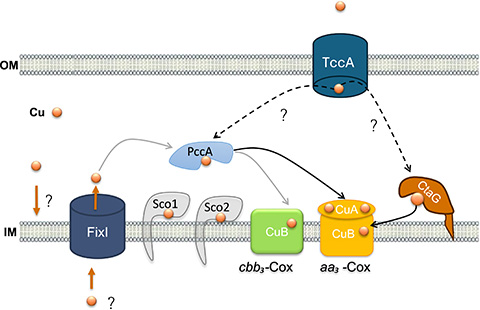 To investigate how copper is delivered to aa3-Cox, researchers performed a genetic screen on a transposon-mutagenized library in a strain lacking both FixI and cbb3-Cox. This screen revealed that TccA, an outer membrane receptor, is required for aa3-Cox activity. They also demonstrated that while cbb3-Cox activity requires the periplasmic chaperone PccA, aa3-Cox activity depends on both PccA and CtaG, an inner membrane protein.