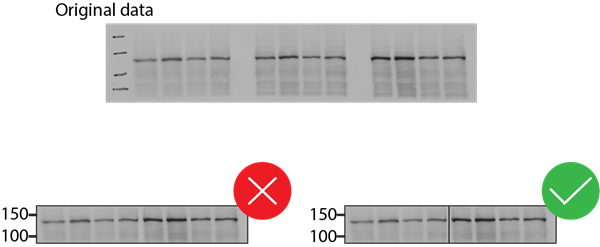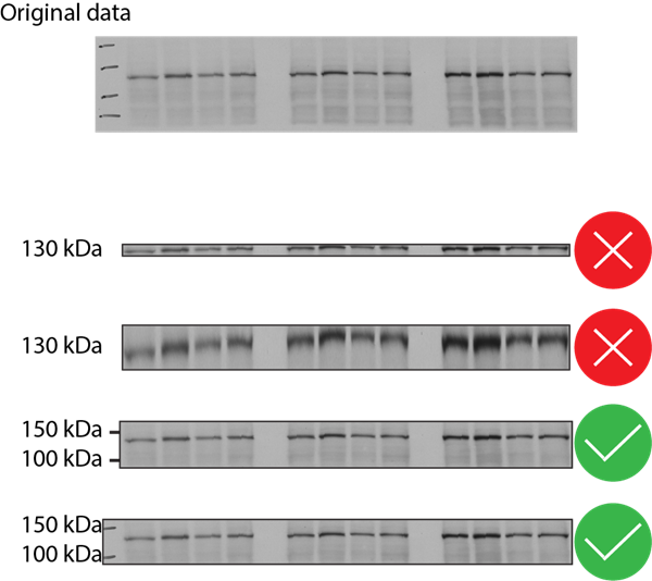 Your gels and blots should show appropriate context: Gels and blots should not be excessively cropped, any spliced-out lanes should be clearly marked, and positions of any molecular weight markers should be clearly indicated. Ideally, you should indicate the position of a molecular weight marker above and below the band(s) of interest.